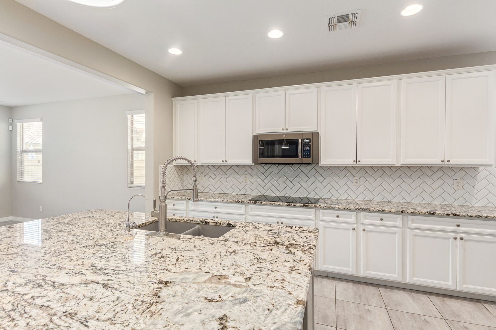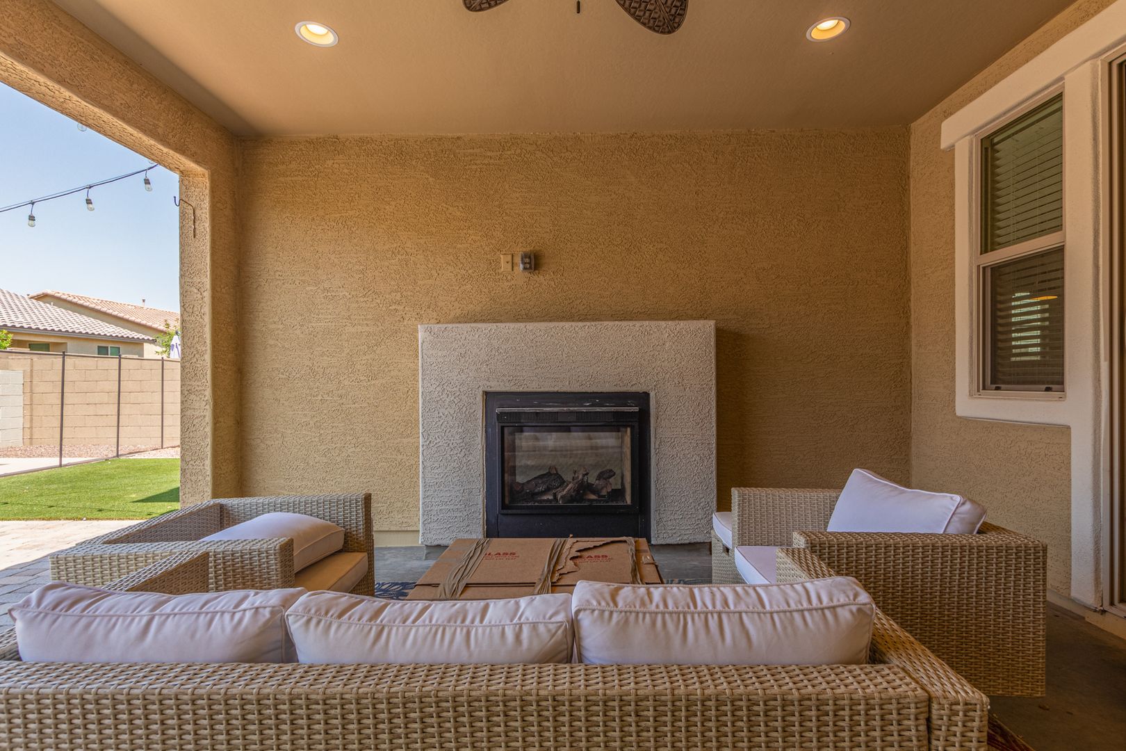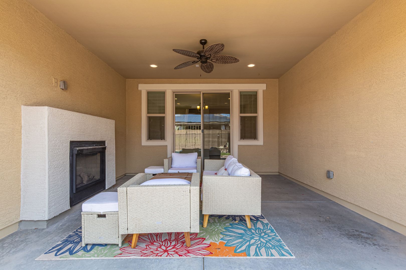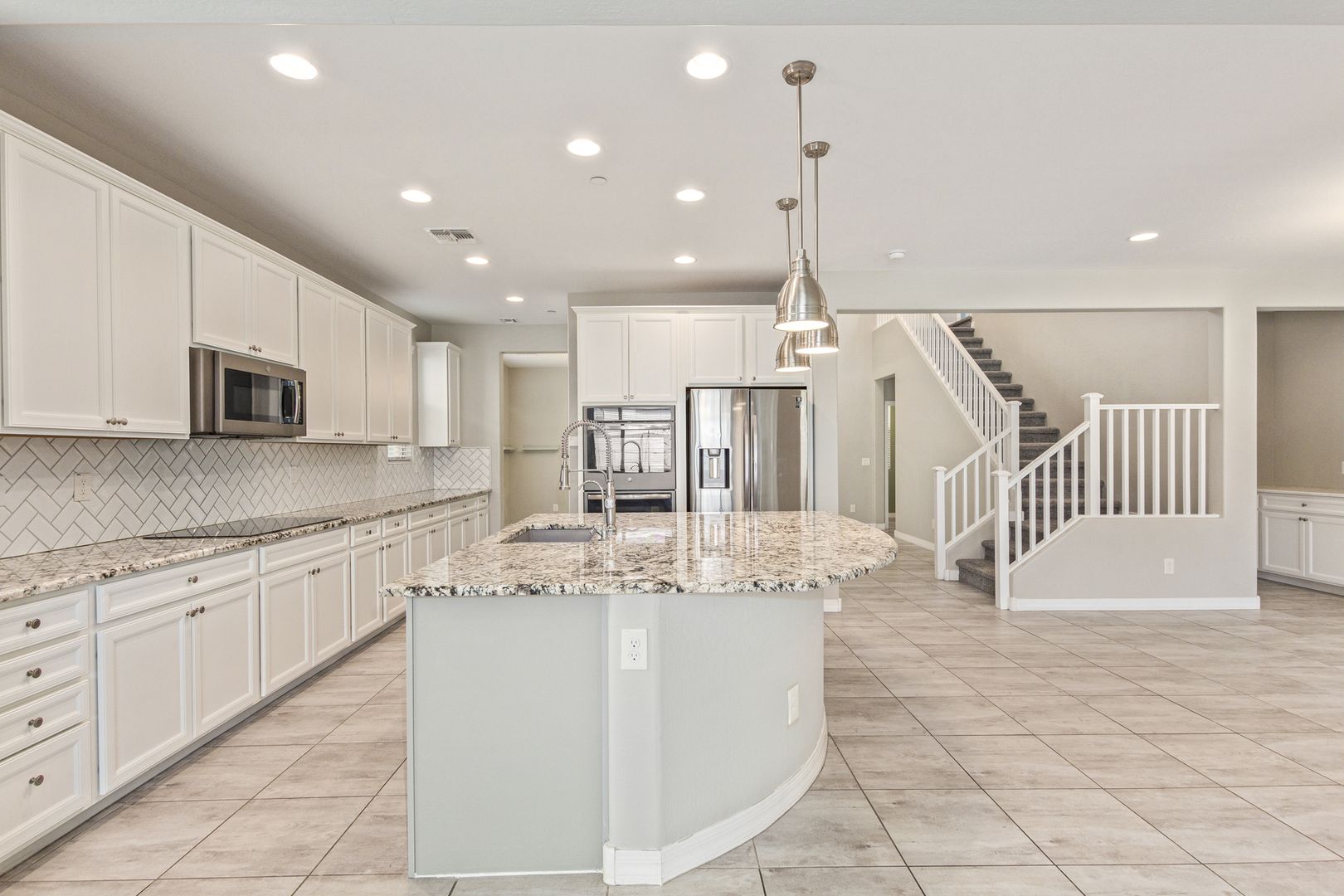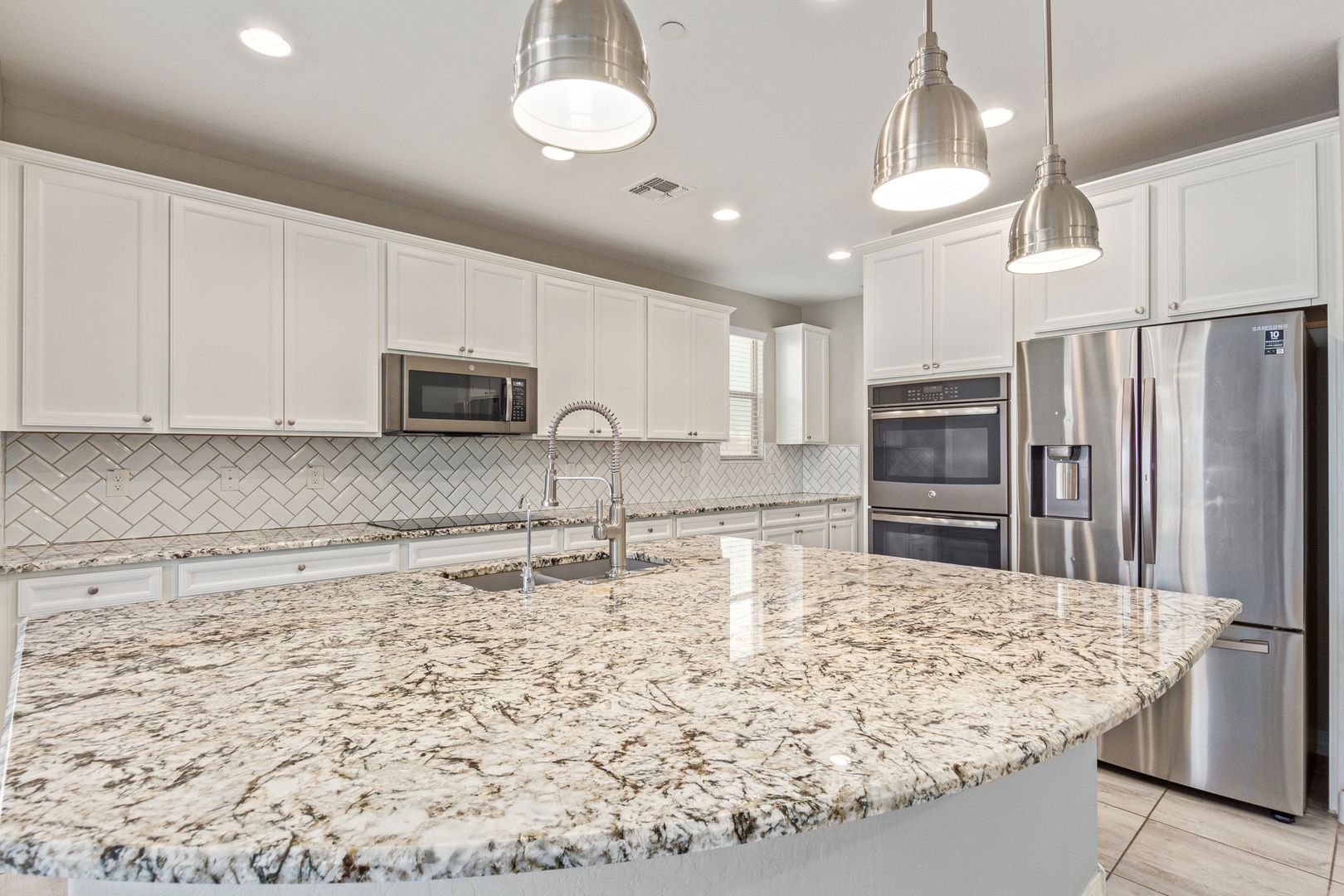 This beauty has so much to offer! Large Island kitchen open to family room w/2-way fireplace to patio* Breakfast bar w/stunning granite & pendant lighting. French door refrigerator w/freezer drawer, double wall ovens, dishwasher, cooktop with tiled backsplash. First floor is all tiled & includes: 2nd Master Bedroom, Den, Powder Rm, Dining Rm, Living Rm, Family Rm, Kitchen* Upstairs features laundry room w/laundry sink, master bedroom w/double vanities, sep shower/tub & walk-in closet, huge loft, hall bathroom & 3 secondary bedrooms. Perfect backyard w/fenced play pool, turf, covered patio w/fireplace, patio furniture is included in lease. Weekly pool service is included in lease*3-car tandem garage*Dogs, if approved $50/mo, per dog,$350 dep, per dog* $195 admin fee